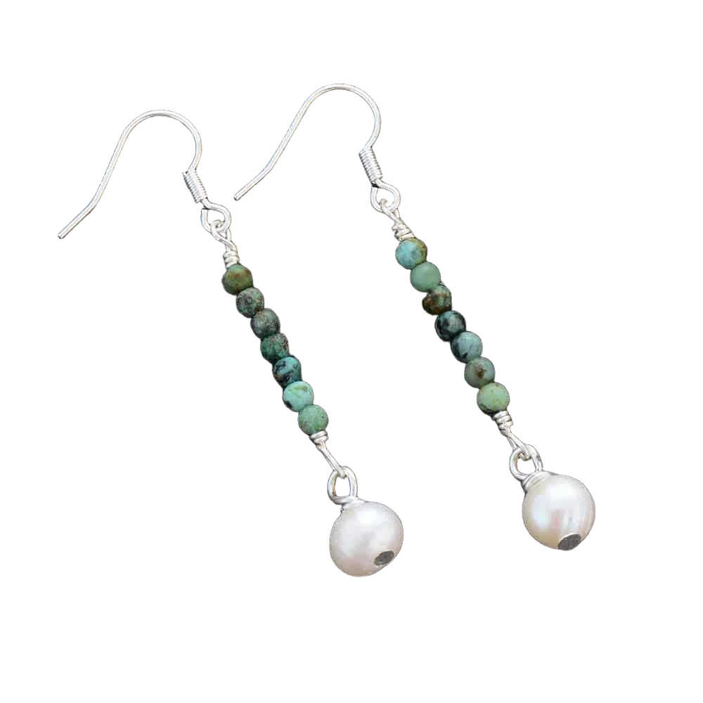 Add a touch of boho chic to your style with these African Turquoise and Pearl dangle earrings. Perfect for any occasion, the unique combination of turquoise and pearls is sure to make a statement. Bring a playful touch to your jewelry collection with these quirky, one-of-a-kind earrings.