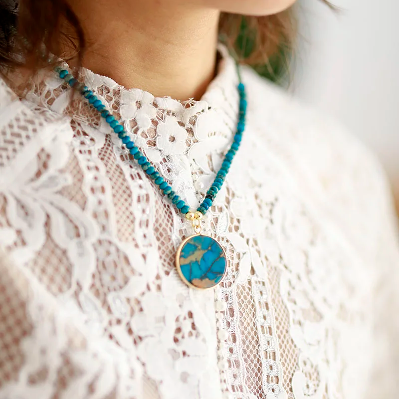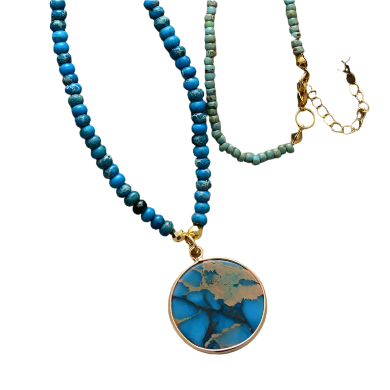 Experience the soothing energy of blue jasper with our boho pendant necklace. The natural stone and intricately beaded design create a unique spiritual piece. Perfect for those seeking balance, healing, and connection to the Earth. Elevate your bohemian style and embrace the power of nature with this stunning necklace.