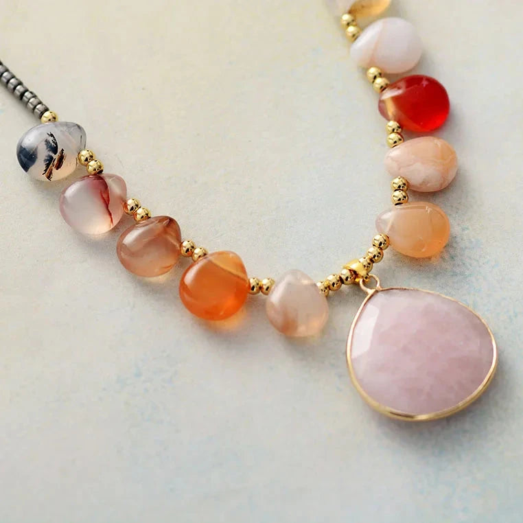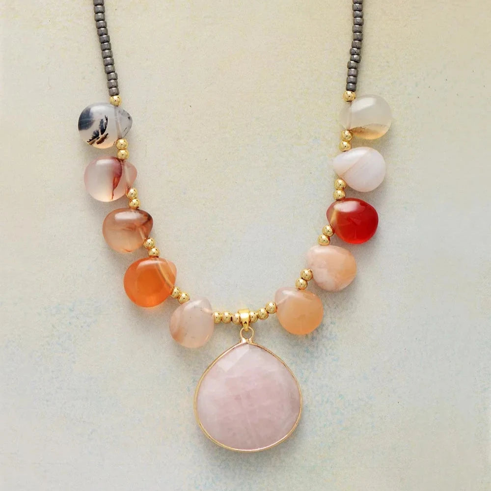 Elevate your style with our handmade Luxury Natural Stones Rose Quartz Pendant Necklace. This boho-inspired necklace features a stunning combination of rose quartz pendant and onyx beads, providing both a chic and calming touch to your outfit. Embrace the healing properties of crystals while making a fashion statement.