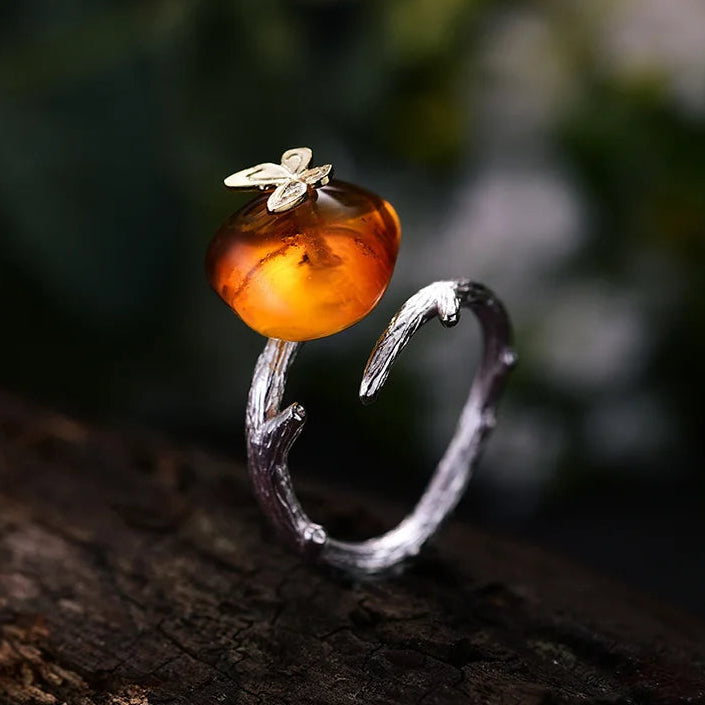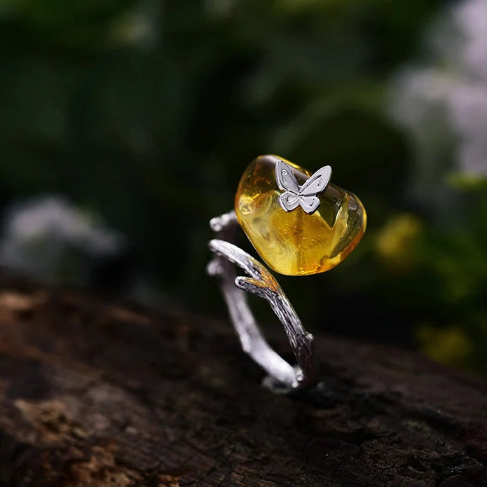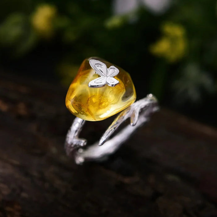 Sterling Silver Butterfly and Natural Amber Adjustable Ring