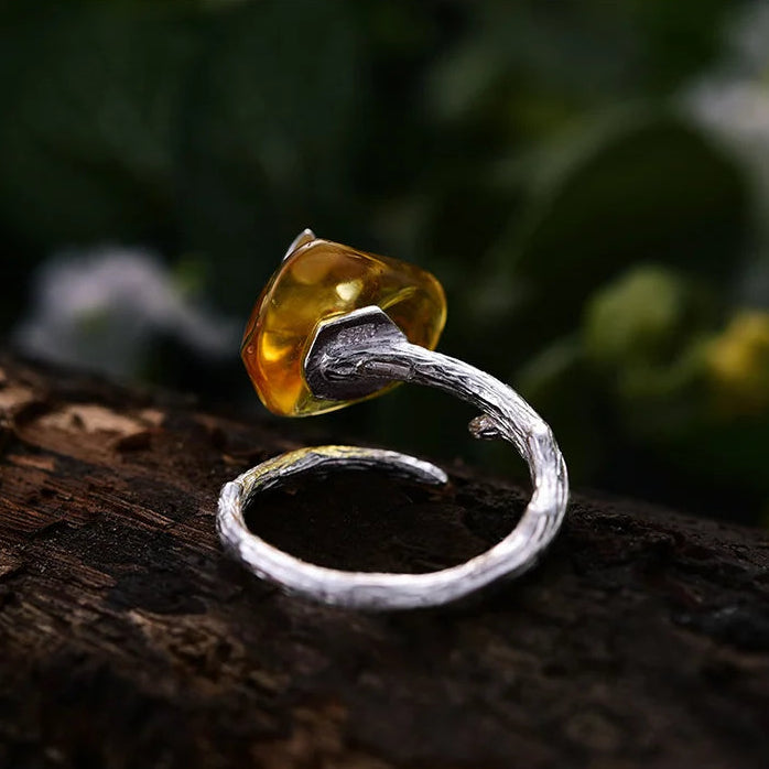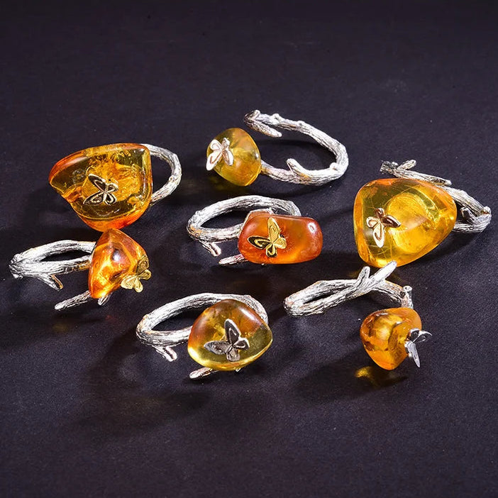 Inspired by nature's beauty, this handmade sterling silver ring features a delicate butterfly and an irregular piece of natural amber. Adjustable to fit any finger, this nature-inspired jewellery piece exudes a calming energy, perfect for those who believe in the healing powers of crystals. Adds a touch of elegance to any outfit.