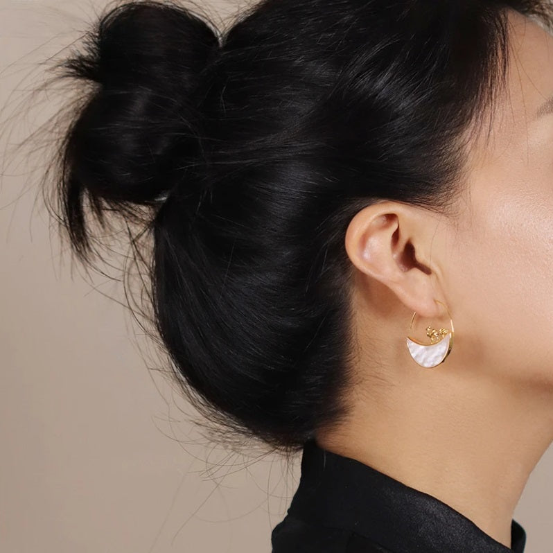 Handmade with sterling silver, these Crescent Moon Mother of Pearl Camel Silk Road Dangle Earrings are a creative addition to any jewelry collection. Each earring boasts a stunning mother of pearl crescent moon, evoking the exotic beauty of the Silk Road. A unique and stylish accessory for any occasion.