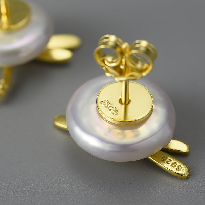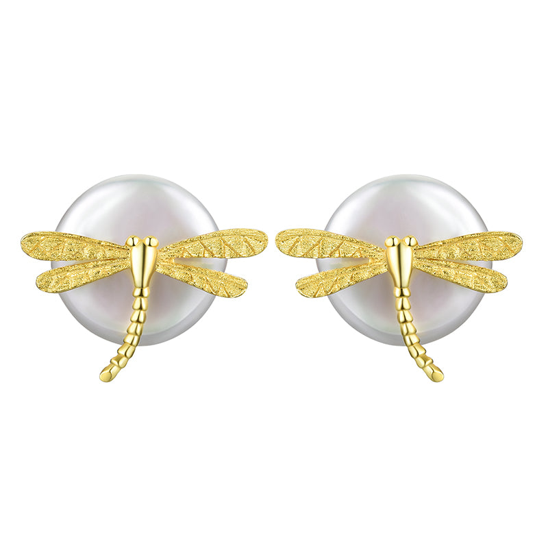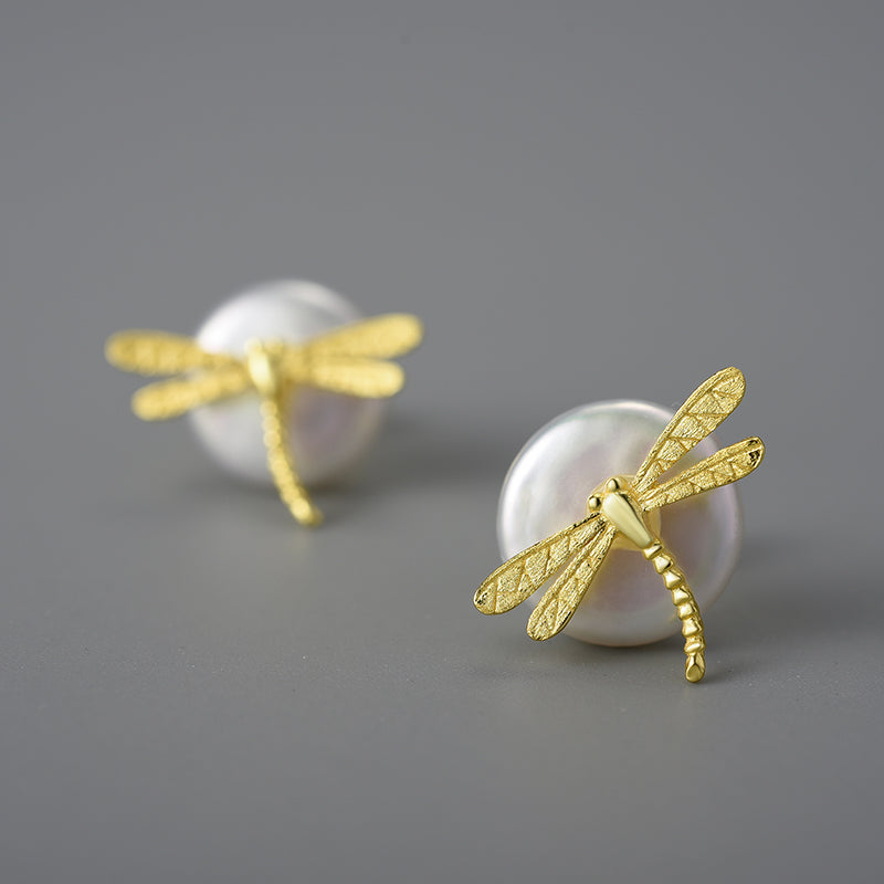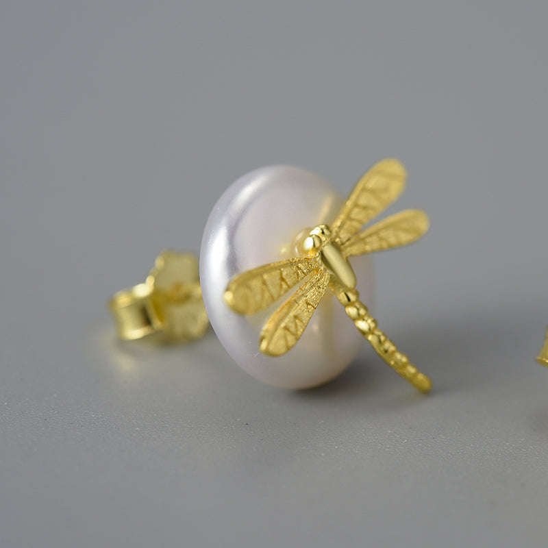 Sterling Silver Dragonfly on the Pearl Stud Earrings