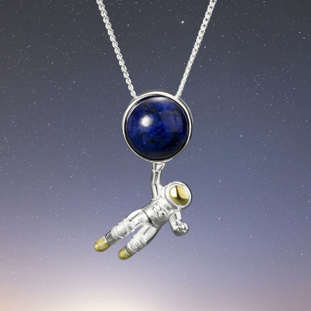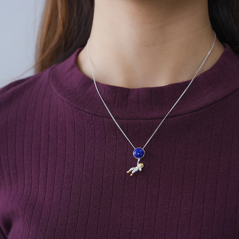 This handmade, sterling silver Lapis Lazuli Space Odyssey Necklace will take you on a crystal journey to the stars. Its stunning Lapis Lazuli crystal and astronaut charm create a truly out-of-this-world accessory. With its delicate handcrafted design, this necklace is the perfect balance of elegance and wonder.