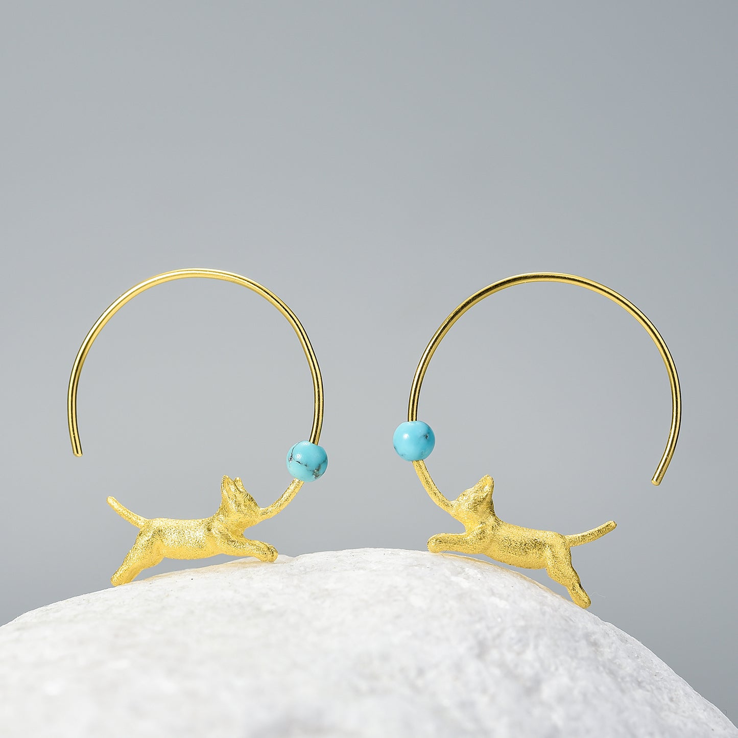 Add some feline fun to your jewelry collection with our Playful Running Cat Earrings. Handcrafted from sterling silver, these creative hoop earrings feature a playful kitty chasing a turquoise balloon. Crystal clear perfection for any cat lover!