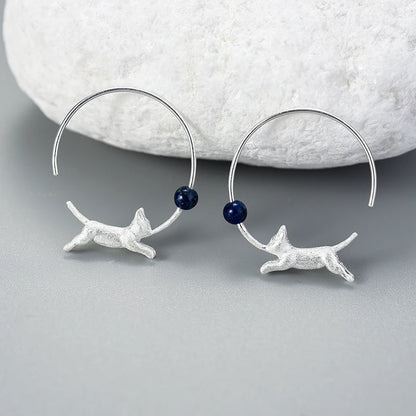 Sterling Silver Playful Running Cat with Balloon Hoop Earrings