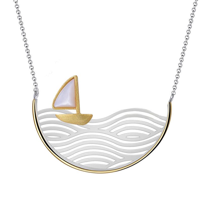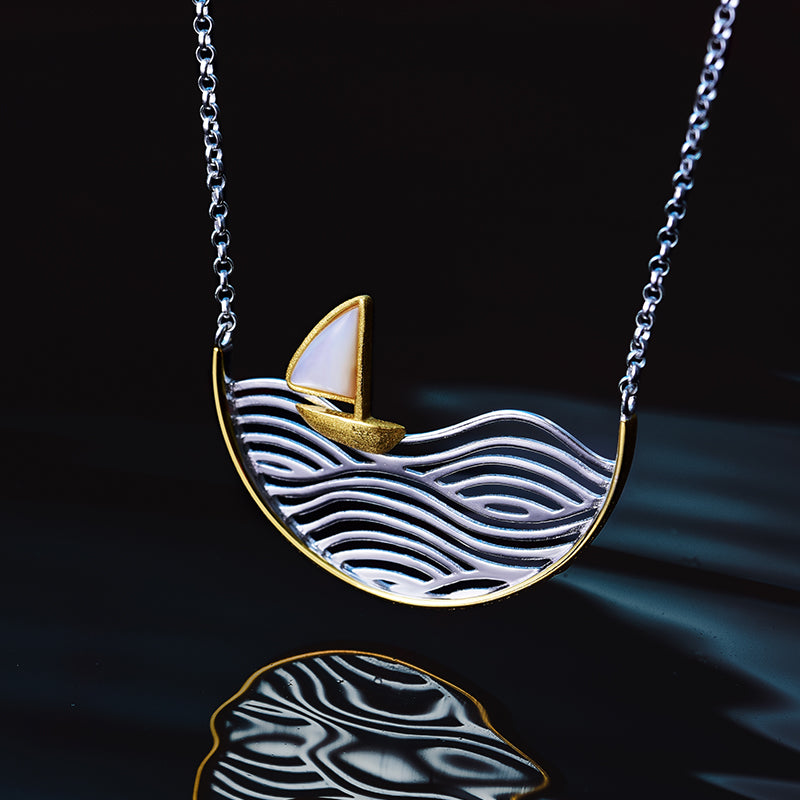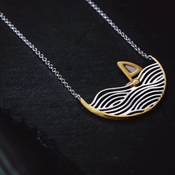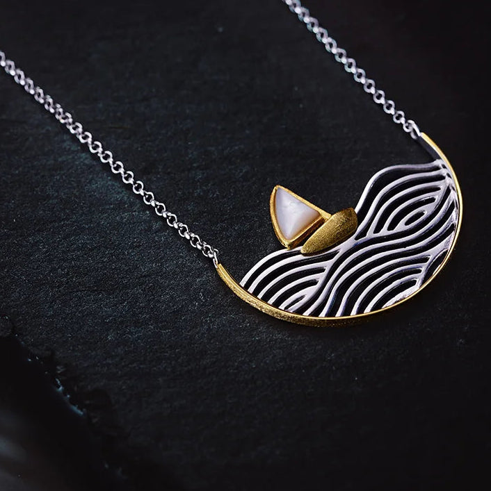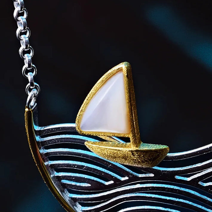 Set sail with this unique handmade necklace featuring a sterling silver sailboat sailing on the ocean pendant. Crafted with care, this necklace is a must-have for any ocean lover or boating enthusiast. Whether you're hitting the high seas or just want to add a touch of nautical charm to your outfit, this necklace is the perfect accessory!